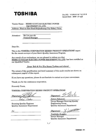 經過日本東芝公司TOSHIBA對我公司的三次考察,順利通過認證,特頒發合格供應商資質證書。